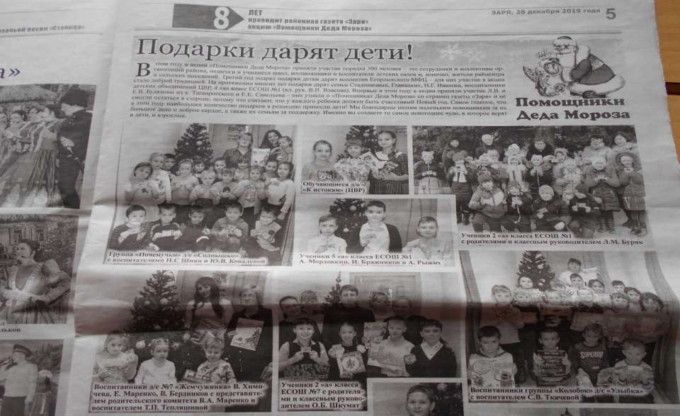 Помощники Деда МорозаОпубликовано: 28-01-2020 19:30В декабре , перед Новым годом наша средняя группа «Дельфинчки» участвовала в акции «Помощники Деда Мороза». Наши дети , их родители и воспитатели, считают, что у каждого ребенка должен быть счастливый Новый год. Вика Х., Ева М. и Сева Б. с воспитателем Тепляшиной Т.П. в редакции газеты «Заря». В редакции газеты , в память об участии в акции «Помощники деда Мороза» был вручен диплом и магнитики. А в этом номере газеты «Заря» дети и их родители увидели себя в фотоотчете. Огромное спасибо, за участие в таком добром деле!!!