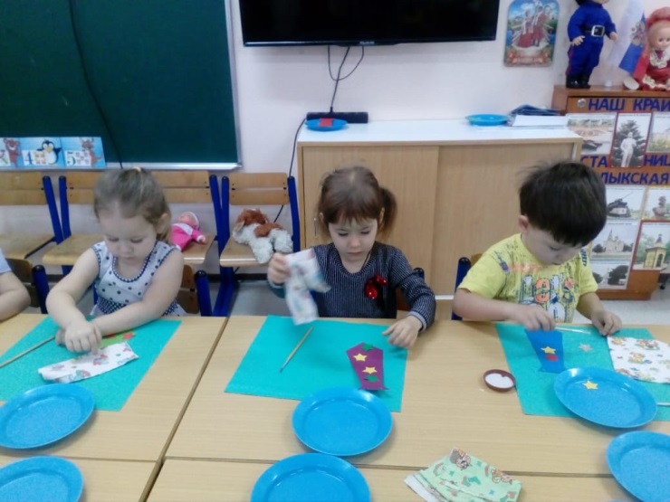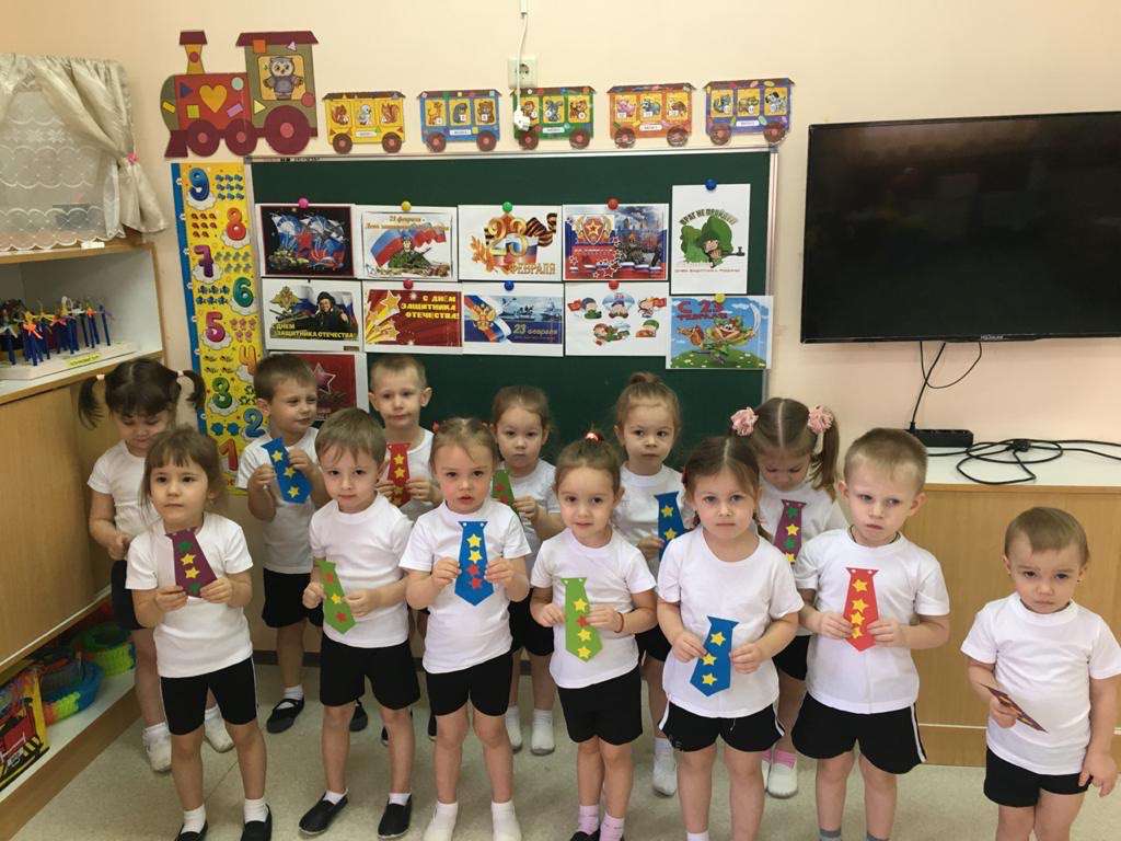 День защитника Отечества в группе «Капельки»Опубликовано: 27-02-2020 19:30День нашей армии сегодня В младшей группе «Капельки» (воспитатель Башмакова Т,И,) прошло тематическое занятие, посвященное Дню защитника Отечества. С детьми была проведена беседа, из которой ребята узнали, кто такие защитники Отечества, о разных родах войск, о военных профессиях, военной техники. С любовью, нежностью и гордостью дети читали стихи о папах, защитниках Отечества. Показали спортивную зарядку с флажками по музыку «Как солдаты наши…».Играли в различные игры: «Самолеты», «Снайперы», «Боеприпасы». Затем исполнили танец «Становись скорей в кружок». А еще, на праздники принято дарить подарки, вот и мы с детьми решили сделать для пап замечательные галстуки.