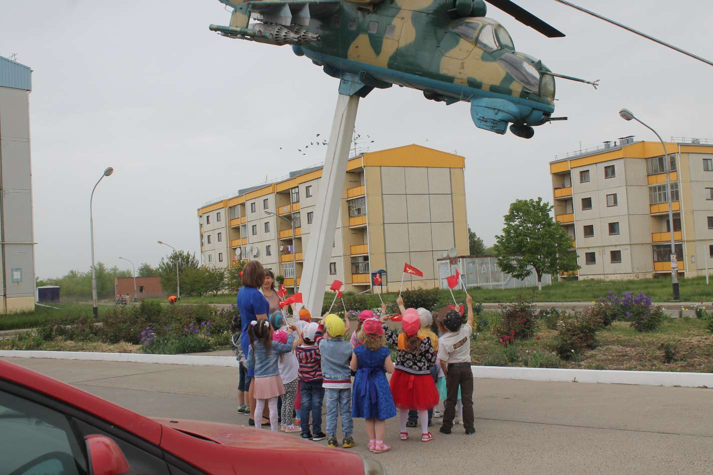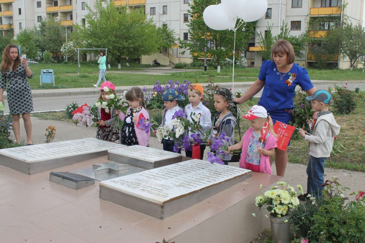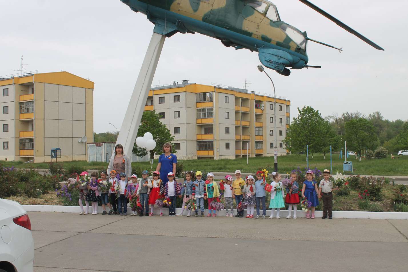 В праздничные дни к памятникам Великой Отечественной войны возлагаются цветы. Так воспитанники детского сада № 7 в преддверии праздника совершили патриотическую экскурсию к памятнику Героям – вертолётчикам под руководством воспитателей Бех Т.Ю., КостенкоЛ.Г., младшего воспитателя Пацуковой А.Н., родителя Бахолдиной С.В. Ребята надели георгиевские ленты, взяли в руки цветы и флажки. Торжественная церемония возложения цветов сопровождалась минутой молчания в память всех погибших. Минута молчания – знак почтения всем людям, отдавшим свои жизни за то, чтобы сегодня у нас над головой было мирное небо. Дошкольники возложили цветы, прочитали стихи о Великой Победе, посвященные героям военных действий, которые эхом уходили в безмолвное хмурое небо. Затем, взявшись за руки, дети выпустили в небо белые воздушные шары, как символ памяти и скорби. Воспитатель: Бех Т.Ю.