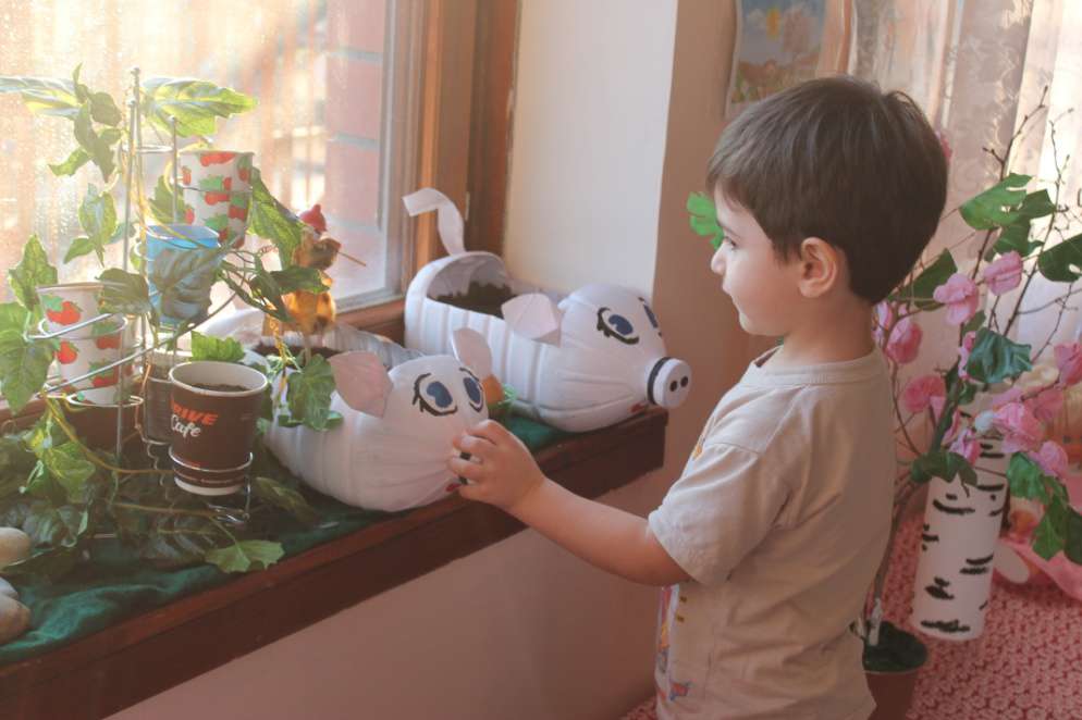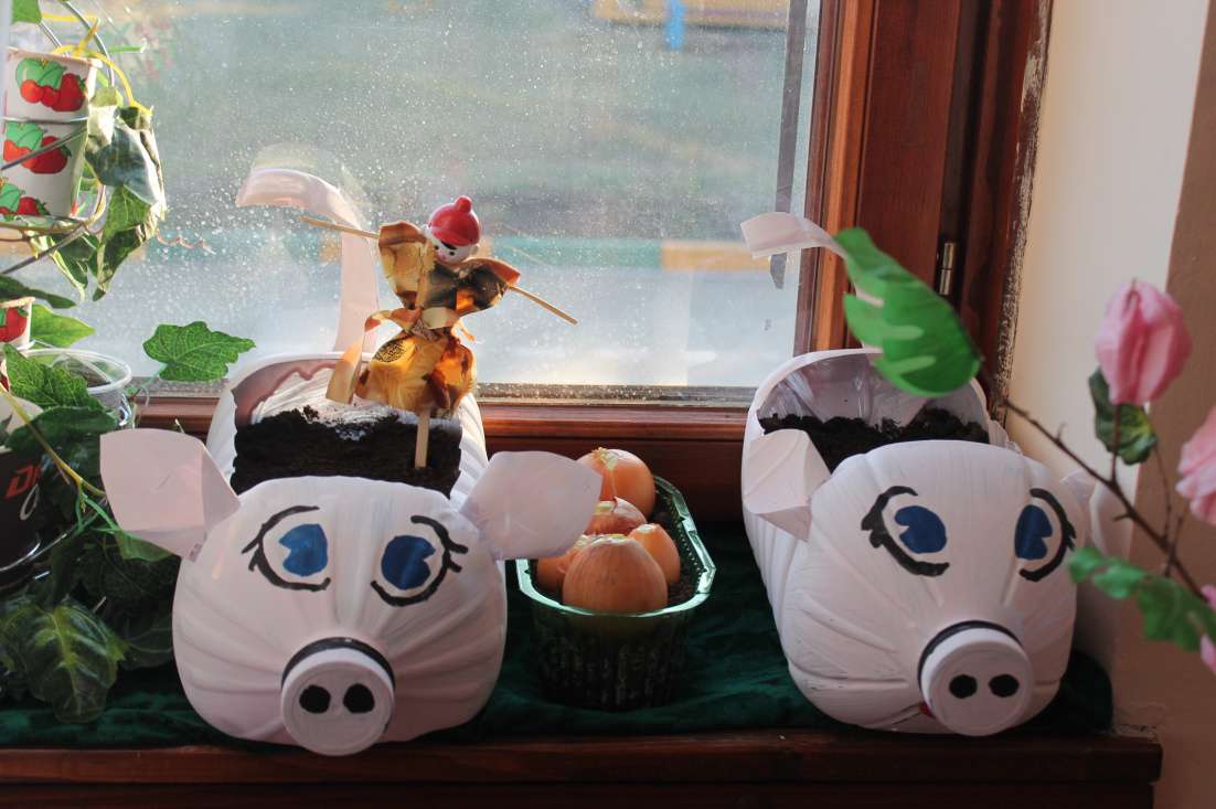 Из верхней части вырастут зелёные перышки, она должна быть над землёй.Показать детям, как правильно посадить луковицы в землю. Посадили пять луковиц. Предложить детям полить лук.