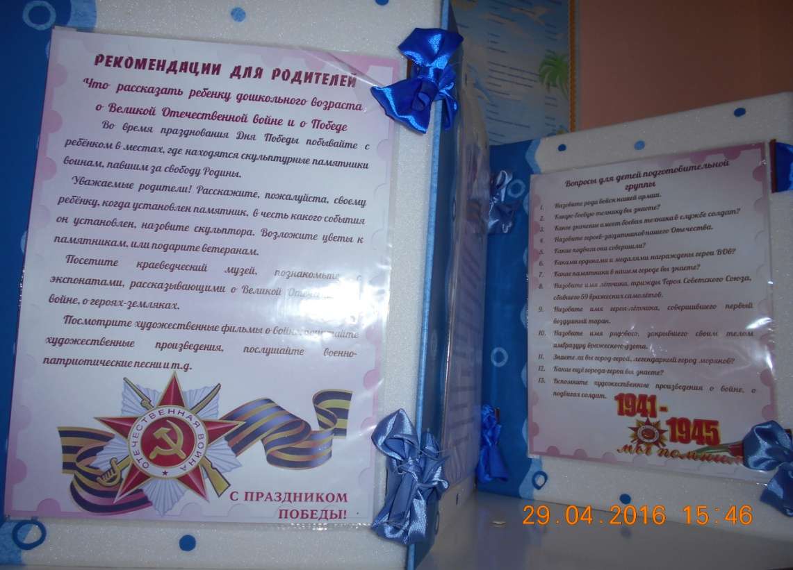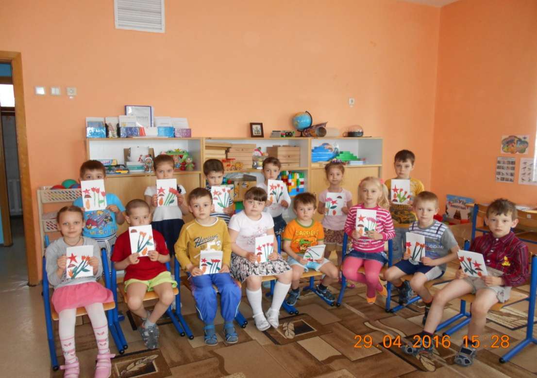 Дети слушали рассказ воспитателя о подвигах наших земляков-вертолетчиков. Подвиг наших земляков бессмертен, пока подрастающее поколение помнит о нем. Верно сказано: «Забыл прошлое — потерял будущее!» Мы должны не только помнить, но и быть достойны их великого Подвига! ![]() Подготовила: воспитатель Бех Т.Ю. Тематическая неделя к празднику 9 МаяОпубликовано: 05-05-2016 08:22У меня есть пистолет. Есть и сабля, есть и танки. Я большой и мне 6 лет! Я в солдатики играю. Это детская игра. Но я это знаю твердо – Создан Мир наш для Добра! Чтоб войну не знали дети! Чтоб был мирным небосвод. И остался чтоб игрушкой Навсегда пехотный взвод. ![]() Хотим под мирным Небом жить, И радоваться, И дружить, Хотим, Чтоб всюду на планете Войны совсем Не знали дети! ![]() День Победы, 9 Мая – Праздник мира в стране и весны. В этот день мы солдат вспоминаем, Не вернувшихся в семьи с войны. В этот праздник мы чествуем дедов, Защитивших родную страну, Подарившим народам Победу И вернувшим нам мир и весну! ![]() Наши дети с воспитателем Утагановой А.В. подготовили подарки для своих дедов и отцов. ![]() Воспитатель Тепляшина Т.П. подготовила папку –передвижку для родителей. « Что рассказать ребенку дошкольного возраста о Великой Отечественной войне и Победе» ![]() Отряд ЮПИД « Юные пешеходы» (старшая разновозрастная группа) с воспитателем Тепляшиной Т.П. принял участие в акции «Красная гвоздика», которая проходила 4 мая 2016г. Ленточку от ордена Победы - Мы сегодня всею группой празднуем Праздник, нам подаренный прадедом. ![]() Но, словно огонь, у подножья – гвоздика. Никто не забыт и ничто не забыто. В нашей группе ИМЕНИНЫОпубликовано: 04-05-2016 08:22Лампы светят ярко, И кому так в этот день Весело и жарко? И не зря в это час Пироги с вареньем. А у нас, а у нас – День ... Рожденья! (З. Петрова)