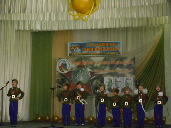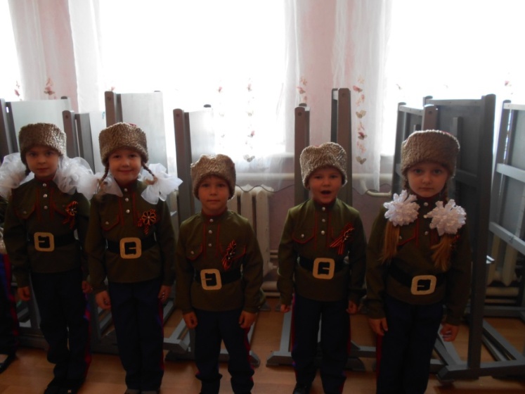 06.05.2016г. согласно комплексному плану воспитательных мероприятий отдела образования Администрации Егорлыкского района на 2015 – 2016 учебный год, приказа отдела образования № 2 от 11.01.2016г. «О проведении районного фестиваля «Военной песни и пляски», в целях развития творческих способностей у детей; выявления и поддержки талантливых детей, в преддверии праздника «Дня Победы», воспитанники старшей разновозрастной группы «Дельфинчики (воспитатель Тепляшина Т.П., музыкальный руководитель Дейнекина М.Г.) приняли участие в районном фестивале «Военной песни и пляски» среди муниципальных бюджетных дошкольных образовательных учреждений с казачьей песней «Эх, казачата!».