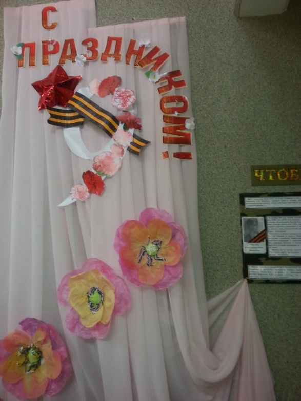 Подготовила: воспитатель Башмакова Т.И. Жемчужинка готова к празднованию 9 МаяОпубликовано: 06-05-2016 09:27![]() Наше учреждение не исключение – в преддверии праздника в ДОУ прошли тематические занятия, беседы, организованы были экскурсии к памятнику, поздравления ветеранам. Чтобы создать праздничную, радостную атмосферу, педагогами были оформлены помещения возрастных групп, холл. Цветная бумага, клей, ножницы, георгиевская лента, ветки искусственных цветов были помощниками в реализации задуманного. Ведь красивое, красочное оформление детского сада всегда приносит детям восторг!